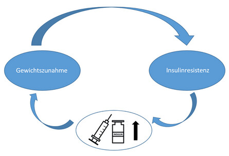 Nach Diagnose besteht bei vielen Patienten die Sorge, dass die Insulintherapie eine Gewichtszunahme begünstigt. Patienten nehmen in der Regel nach Beginn der Insulintherapie zu, da mit der wiederhergestellten Insulinwirkung die Energie nun erneut in den Zellen gespeichert werden kann. Dies kann zu einer physiologischen Gewichtszunahme beitragen. In der Tat stimuliert Insulin als anaboles Hormon die Fettspeicherung (Lipogenese) und hemmt den Fettabbau (Lipolyse). Diese Funktionen hat Insulin auch beim stoffwechselgesunden Menschen. Der entscheidende Unterschied liegt jedoch in der Verteilung und Regulation des Insulins. Physiologisch gelangt Insulin zunächst zur Leber und wird bedarfsgerecht in Abhängigkeit vom Blutzucker ausgeschüttet. Bei der subkutanen Injektion im Rahmen der Therapie wird diese hepatische Regulation teilweise umgangen, sodass die Wirkung direkt im peripheren Gewebe einsetzt. Wird Insulin dabei nicht exakt am metabolischen Bedarf ausgerichtet und zu hoch dosiert, gerät das System aus dem Gleichgewicht. Dies kann eine verstärkte Fettspeicherung und langfristig die Entwicklung einer Insulinresistenz verstärken. Nicht das Insulin an sich verursacht daher die unerwünschte Gewichtszunahme, sondern die Kombination aus inadäquater Insulindosierung und einem Energieüberschuss. Bei einem sogenannten Doppeldiabetes, also dem gleichzeitigen Vorliegen einer Insulinresistenz bei Typ-1-Diabetes, kann ein Teufelskreislauf entstehen: Durch die verringerte Insulinwirkung werden höhere Insulindosen erforderlich, was wiederum zu einer Gewichtszunahme führt, die eine Insulinresistenz weiter verstärkt. Eine zu hohe Insulindosierung kann zudem vermehrt Hypoglykämien auslösen. Diese gehen häufig mit ausgeprägten Heißhungerattacken einher, die meistens dazu führen, dass mehr schnell wirksame Kohlenhydrate gegessen werden, als zur Behandlung der Unterzuckerung nötig wären. Das wiederum begünstigt einerseits erneute Blutzuckerschwankungen und damit verbundene Insulinanpassungen, andererseits eine erhöhte Kalorien- und Zuckeraufnahme.