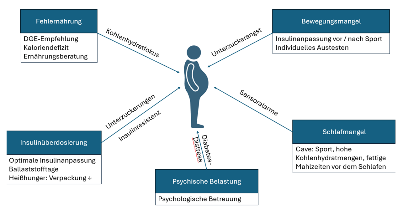 Eine Regulation der Energiebilanz wird von mehreren hormonellen, neurobiologischen und psychologischen Prozessen beeinflusst. Diese Prozesse gestalten sich bei Menschen mit Typ-1-Diabetes durch die veränderte Stoffwechsellage und die notwendige Insulintherapie weitaus komplexer. Ein erhöhter Therapiestress sowie ein dauerhafter Fokus auf die Ernährung und den Blutzucker können Essstörungen, depressive Symptome und Schlafmangel begünstigen. Solche Faktoren können laut Adipositas-Leitlinien das Risiko für Übergewicht erhöhen. Aufgrund der in den letzten Jahren steigenden Prävalenz von Übergewicht bei Menschen mit Typ-1-Diabetes sowie der damit verbundenen zunehmenden Herausforderungen in der Stoffwechselkontrolle und im kardiometabolischen Risikomanagement, besteht ein dringender Bedarf an evidenzbasierten Strategien.