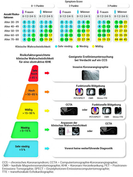 Ermittlung Vortestwahrscheinlichkeit und geeignete Erstlinientests bei symptomatischen Patient:innen mit Verdacht auf chronisches Koronarsyndrom (modifiziert nach DGK Pocket Guideline Chronisches Koronarsyndrom und ESC-Guideline for the Management of chronic coronary syndromes 2024).