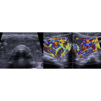 Abbildung 1: Sonografie der Schilddrüse bei Morbus Basedow, die untere Abbildung zeigt die vermehrte Durchblutung mittels Dopplersonografie