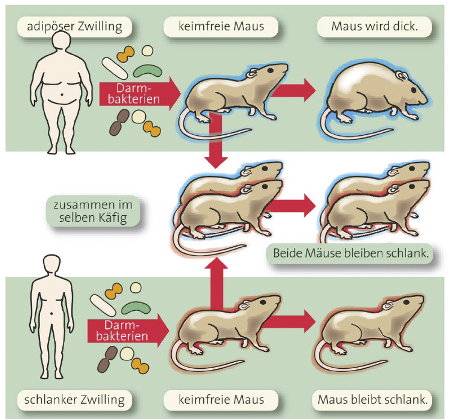Gleiches gilt auch für diese Frage. Um Sie für diesen kommenden Schwerpunkt neugierig zu machen, wollen wir Ihnen im Vorgriff ein klassisches Mensch-Tierexperiment zu dieser Thematik vorstellen. Transplantiert man die Darmflora von Zwillingen, von denen der eine schlank und der andere adipös ist auf keimfreie Mäuse, so hängt der weitere Gewichtsverlauf der Mäuse vom Ausgangsgewicht des jeweiligen Zwilling ab.