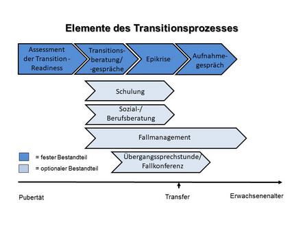 Abbildung: Elemente des Transitionsprozesses von chronisch kranken Jugendlichen von pädiatrischen zu erwachsenenorientierten Behandlungseinrichtungen.
