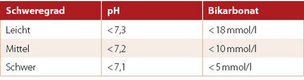 Die DKA wird je nach pH und Bikarbonatwert in unterschiedliche Schweregrade eingeteilt (Tabelle 1).