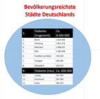 - Inzidenz: Jährlich erkranken mehr als 600 000 Menschen in Deutschland an Typ-2-Diabetes - oder anders ausgedrückt: Pro Jahr ca. 1 von 100 Erwachsenen [Tönnies, Rathmann 2021]. In dem aktuellen Diabetes-Atlas der Internationalen Diabetes Federation (IDF) (Abbildung 1) wird der Diabetes symbolisch mit den bevölkerungsreichsten Ländern verglichen, um die Gesamtanzahl aller Menschen mit Diabetes zu illustrieren. Würde man dies auf Deutschland übertragen, wäre Diabetes die größte Stadt in Deutschland – mehr als doppelt so groß wie Berlin – und selbst die jährliche Neuerkrankungsrate läge symbolisch auf dem 8. Platz aller Städte in Deutschland. Mit anderen Worten: Jedes Jahr erkranken in Deutschland so viele Menschen wie eine Großstadt an Typ-2-Diabetes.