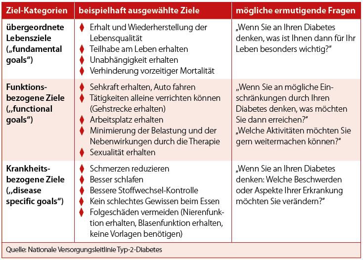 Menschen mit Diabetes sollen hier für sich initial und regelmäßig im Verlauf ihre Lebensziele definieren und einordnen lernen (Tab. 3).