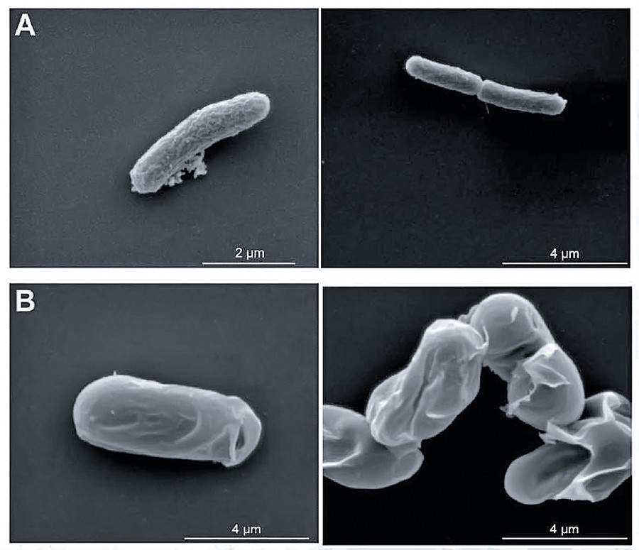 Die Wirkung von medizinischem Plasma auf Bakterien zeigt sehr plastisch eine Publikation von Dezest M et al. aus dem Jahr 2017. Hier wurden neben den statistischen Untersuchungen mikroskopische Bilder von Escherichia coli (E. coli) vor und nach Anwendung des Verfahrens dargestellt. Recht deutlich zu erkennen ist die zerstörte Oberfläche der Bakterien nach Behandlung (Abb. 2).
