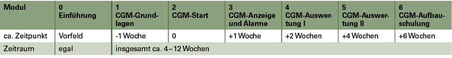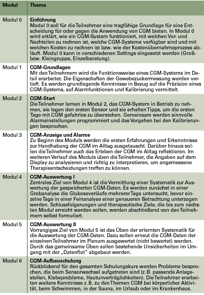 Patienten, die sich für CGM interessieren, sollen zunächst am Einführungsmodul ("Modul 0") teilnehmen. Dieses Modul kann je nach Setting z. B. im Rahmen einer Informationsveranstaltung oder als Teil einer ICT- oder Insulinpumpenschulung eingesetzt werden. Nach der Teilnahme an Modul 0 sollte bei Interesse ein Gespräch mit dem Diabetesteam stattfinden, so dass sich die Patienten fundiert für oder gegen eine Therapieunterstützung durch Nutzung eines CGM-Systems entscheiden können.