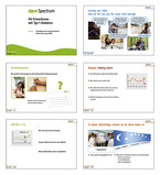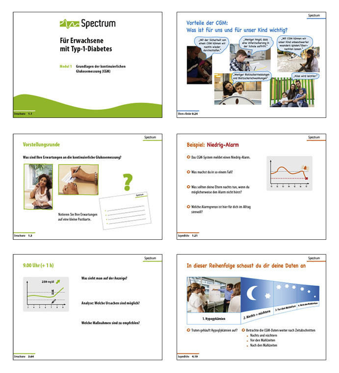Das Schulungs- und Behandlungsprogramm SPECTRUM besteht aus spezifischen Foliensätzen für Erwachsene (7 Module), Eltern mit jüngeren Kindern (6 Module) und Jugendliche mit Typ-1-Diabetes (6 Module) (Beispiele siehe Abbildung 2). Die Foliensätze sind in digitaler Form auf einem USB-Stick erhältlich und in den Maßeinheiten mg/dl und mmol/l verfügbar. Des Weiteren stehen im SPECTRUM-Materialordner ausführliche Curricula zu den drei Versionen in gedruckter Form zur Verfügung. Als Patientenmaterialien enthält der USB-Stick diverse Arbeitsblätter und Checklisten, die für die Schulungsteilnehmer jeweils in der passenden Maßeinheit ausgedruckt werden können. Ab Ende 2015 wird SPECTRUM durch den Kirchheim-Verlag vertrieben. Die notwendigen Grundkenntnisse für die Schulung mit SPECTRUM werden in Train-the-Trainer-Seminaren vermittelt, die Durchführung dieser Seminare wird im Jahr 2016 beginnen.