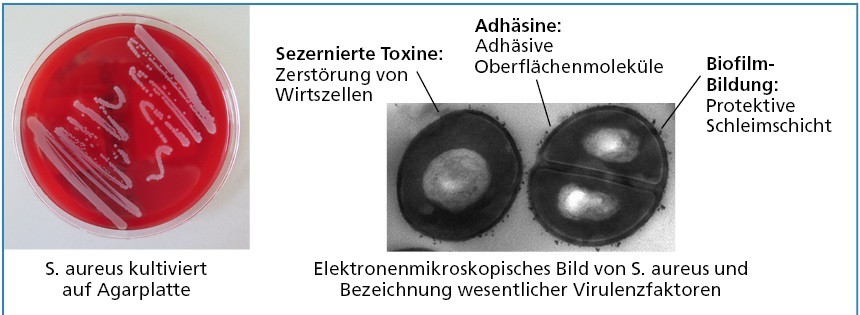 Diese Adhärenz stellt einen ersten wichtigen Schritt im Infektionsgeschehen dar. Weiterhin sezerniert S. aureus eine Vielzahl von Toxinen, die Wirtsgewebe zerstören können und das Eindringen der Bakterien in tiefe Gewebeschichten ermöglichen. In der aktuellen Wissenschaft wird S. aureus zunehmend als intrazelluläres Pathogen wahrgenommen, da die Bakterien in verschiedene Wirtszellen eindringen und dort für längere Zeit verbleiben (persistieren) können.