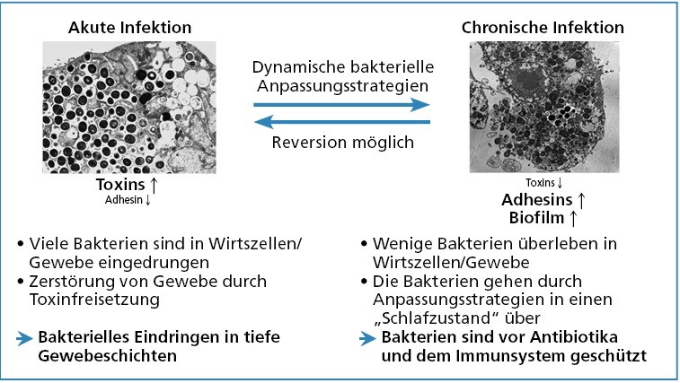 Während einer langen intrazellulären Persistenz regulieren die Bakterien ihre Adhärenz hoch und ihre Toxinproduktion als auch den Stoffwechsel herunter und treten in eine Art "Schlafzustand" ein. Dadurch werden sie von dem Immunsystem des Wirtes nicht erkannt. Aufgrund ihrer niedrigen Stoffwechselleistung überleben sie auch Antibiotikatherapien.