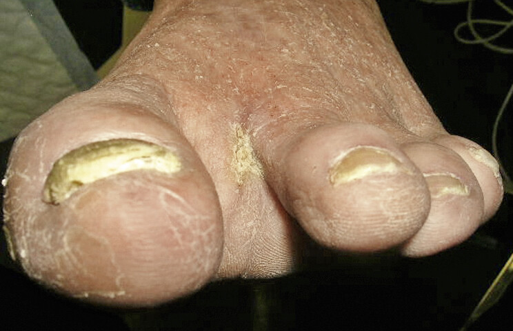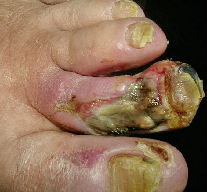 Es besteht eine ausgedehnte Gewebsnekrose an der 2. Zehe links; der Knochen liegt frei. Dieses klinische Bild könnte fehlgedeutet werden als Folge einer arteriellen Perfusionsstörung.