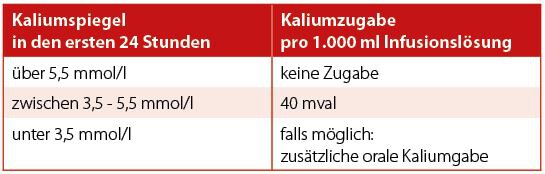 Solange kein Insulin oder Bikarbonat gegeben werden, ist die Kaliumsubstitution problemlos. Mit der Gabe von Insulin kann Kalium sehr rasch fallen, so dass eine adäquate Substitution nicht mehr möglich ist. Der Insulinperfusor sollte dann gestoppt werden, bis sich das Kalium wieder im normalen Bereich befindet.