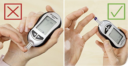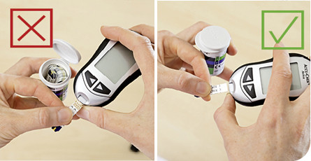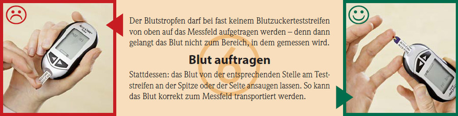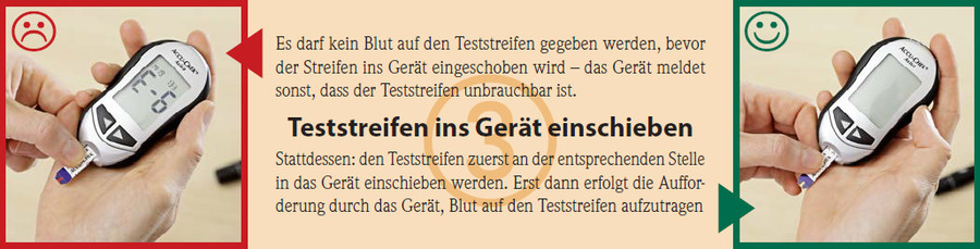 Stattdessen: den Teststreifen zuerst an der entsprechenden Stelle in das Gerät einschieben werden. Erst dann erfolgt die Aufforderung durch das Gerät, Blut auf den Teststreifen aufzutragen