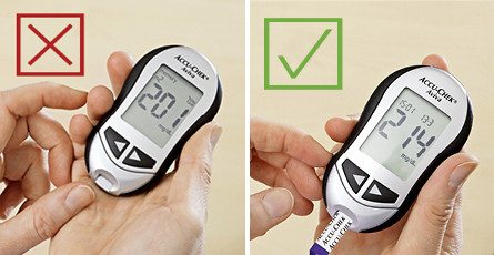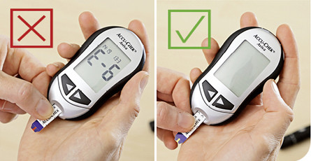 Es darf kein Blut auf den Teststreifen gegeben werden, bevor der Streifen ins Gerät eingeschoben wird – das Gerät meldet sonst, dass der Teststreifen unbrauchbar ist.