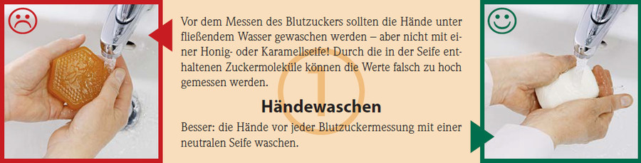 Vor dem Messen des Blutzuckers sollten die Hände unter fließendem Wasser gewaschen werden – aber nicht mit einer Honig- oder Karamellseife! Durch die in der Seife enthaltenen Zuckermoleküle können die Werte falsch zu hoch gemessen werden.
