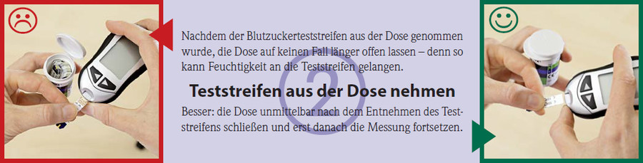 Nachdem der Blutzuckerteststreifen aus der Dose genommen wurde, die Dose auf keinen Fall länger offen lassen – denn so kann Feuchtigkeit an die Teststreifen gelangen.