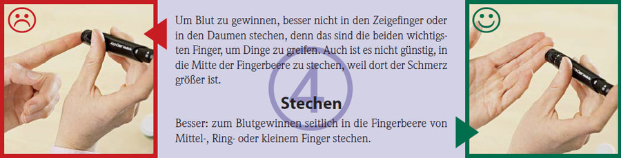 Um Blut zu gewinnen, besser nicht in den Zeigefinger oder in den Daumen stechen, denn das sind die beiden wichtigsten Finger, um Dinge zu greifen. Auch ist es nicht günstig, in die Mitte der Fingerbeere zu stechen, weil dort der Schmerz größer ist.