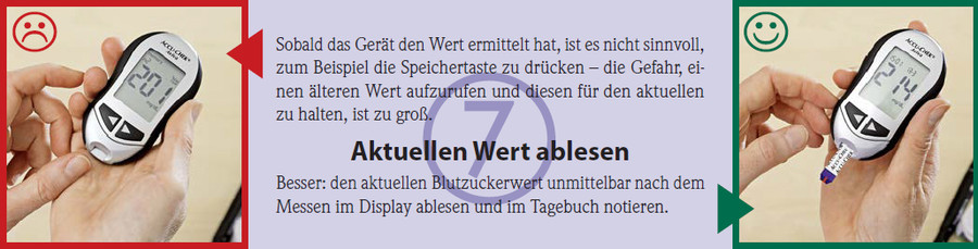 Besser: den aktuellen Blutzuckerwert unmittelbar nach dem Messen im Display ablesen und im Tagebuch notieren.