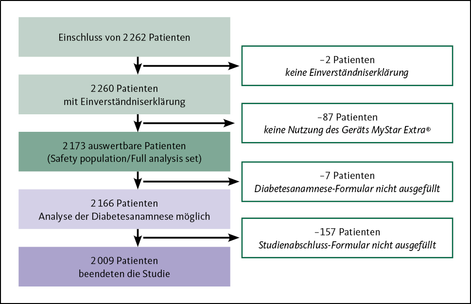 Mit Studienbeginn erhielten die Patienten das Blutzuckermessgerät MyStar Extra® als neues Messgerät inklusive einer Anwendungsschulung durch die Ärzte (≤ 30 min Dauer für 90 % der Patienten). Patienten konnten nicht an der Beobachtungsstudie teilnehmen, wenn mindestens eines der folgenden Ausschlusskriterien zutraf: Gestationsdiabetes, Insulinpumpentherapie, chronisch-obstruktive Lungenerkrankung (COPD), Erkrankungen mit Einfluss auf den HbA1c-Wert (z. B. Anämien), Alkohol- oder Drogenabusus, Demenz.