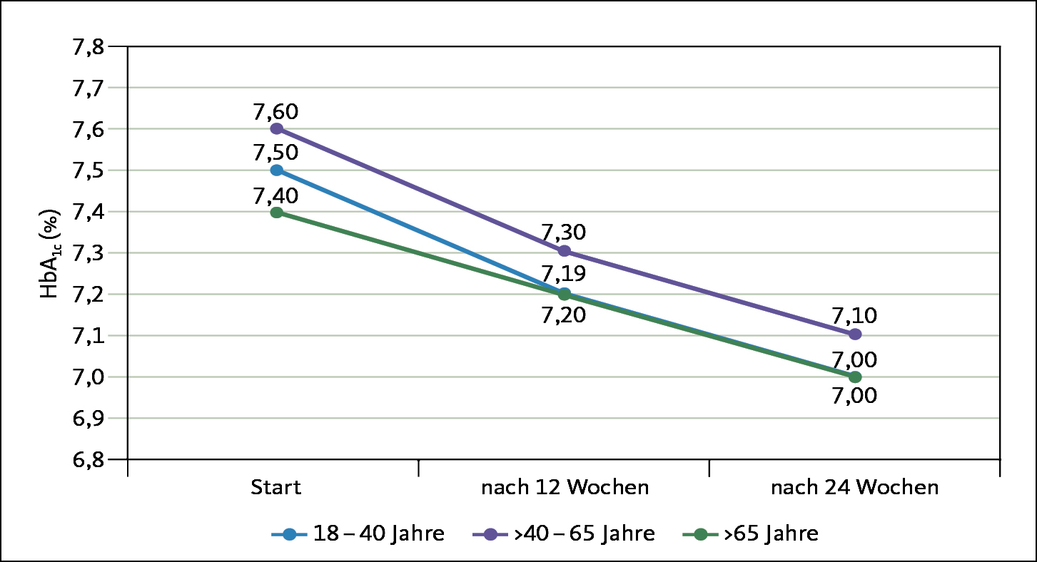 Der mediane HbA1c-Wert verbesserte sich während der Beobachtungsdauer von 7,5 % auf 7,0 % (p < 0,0001, Wilcoxon-Signed-Rank-Test) bei auffällig höheren Werten sowohl zum Start als auch zum Studienende in der Altersgruppe 40 bis 56 Jahre (siehe Abb. 2). Allerdings erreichten nur 22,5 % aller auswertbaren Patienten ihr vereinbartes HbA1c-Ziel, hierunter häufiger Patienten, welche die HbA1c-Schätzung täglich benutzten. Diese Patienten waren älter (64 vs. 62 Jahre, p = 0,0052), häufiger männlich (60 vs. 53 %, p = 0,0085) und wiesen einen höheren Ausgangs-HbA1c-Wert auf als Patienten, die ihr HbA1c-Ziel nicht erreichten. Die Art der Insulintherapie hatte keinen Einfluss auf das HbA1c-Zielerreichen. Ein erreichter HbA1c-Zielwert spiegelte sich in einer höheren Zufriedenheit mit dem neuen Blutzuckermessgerät wider.