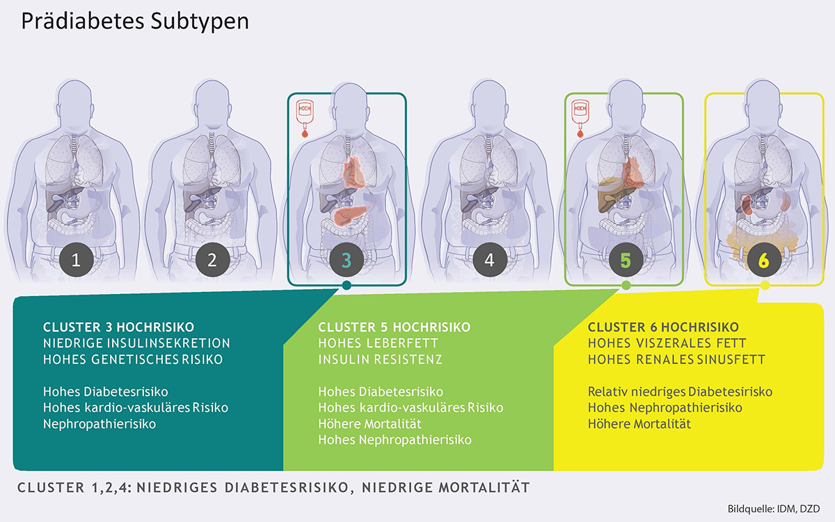 Bei Menschen mit Prädiabetes gibt es sechs klar abgrenzbare Subtypen (Cluster), die sich in der Krankheitsentstehung, dem Risiko für Diabetes und der Entwicklung von Folgeerkrankungen unterscheiden.