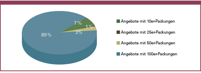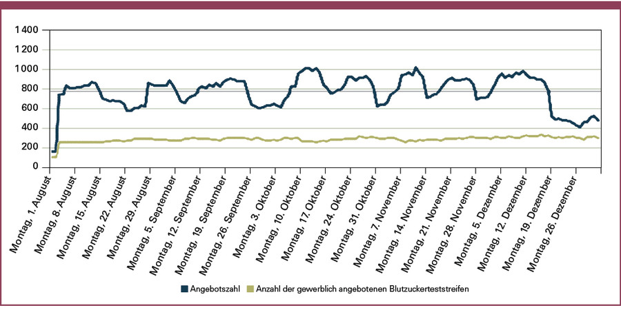 Von Anfang 2011 bis Ende Mai 2012 wurde z. T. täglich der Bestand an sowie der Zugang von Teststreifenangeboten erhoben. Dabei bleib die Zahl der Blutzuckerteststreifen im Angebot relativ konstant (sh. Abb.1), bei etwa 900 pro Tag mit Schwankungen gegen Anfang und Ende des Monats. Knapp 90 Prozent der zum Verkauf gestellten Blutzuckerteststreifen umfassten Angebote mit 100er–Packungen.