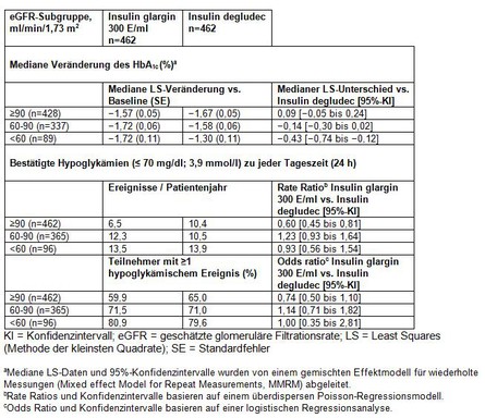 Weitere Ergebnisse zeigten bei Erwachsenen mit Typ-2-Diabetes und normaler Nierenfunktion (eGFR ≥ 90 ml/min/1,73m2) eine niedrigere Inzidenz an bestätigten Hypoglykämien unter Insulin glargin 300 E/ml als unter Insulin degludec (59,9% bzw. 65%) bei vergleichbarer Blutzuckerkontrolle und vergleichbaren Ereignisraten an bestätigten Hypoglykämien. Blutzuckerkontrolle sowie Inzidenz und Ereignisraten bestätigter Hypoglykämien waren bei Erwachsenen mit leichten Nierenfunktionsstörungen (eGFR 60-90 ml/min/1,73m2) vergleichbar.