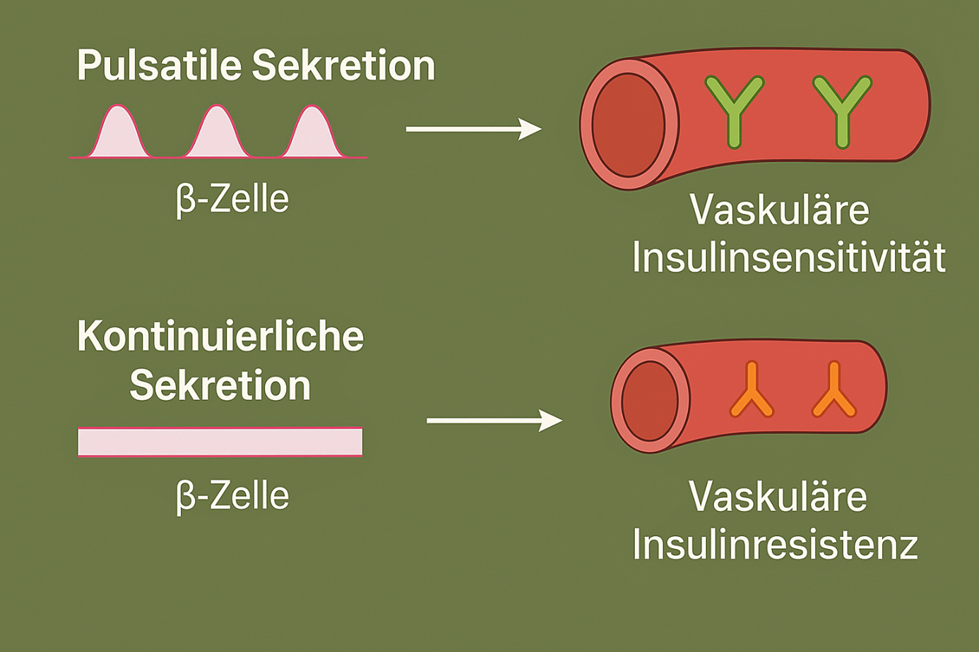 Was periphere vaskuläre Insulinrezeptoren sensitiv hält, ist ein Zusammenspiel von normalen Insulinspiegeln, wenig Entzündung, niedrigem oxidativem Stress, gesunder Endothelfunktion und aktiven, nicht blockierten Signalwegen. Ein deutlich unterschätzter Faktor ist hierbei allerdings die sogenannte Pulsatilität der β-Zellen: die β-Zellen gesunder Personen geben Insulin nicht in einem gleichmäßigen Fluss, sondern in Form von regelmäßigen Pulsen ab. Die Zellen oszillieren und werden durch neuronale Faktoren so synchronisiert, dass eine pulsatile Insulinsekretion mit 10 bis 12 Pulsen pro Stunde beobachtet wird [Pørksen 2002, Hellmann 2009a].