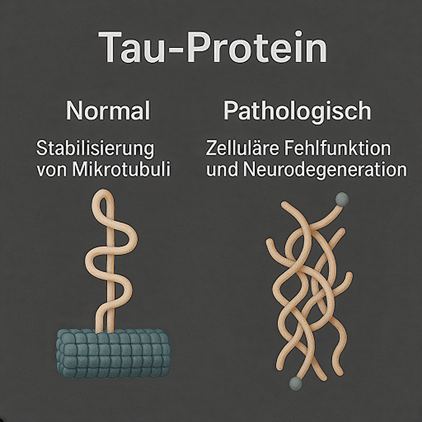 Bei M. Alzheimer und anderen sogenannten Tautopathien (z. B. progressive supranukleäre Blickparese (PSP), kortikobasale Degeneration oder frontotemporale Demenz), verändert sich das Tau-Protein durch übermäßige Phosphorylierung und verliert dadurch die Fähigkeit, die Mikrotubuli zu stabilisieren [Arend 2016]. In Gehirnen, die durch Alzheimer charakterisiert sind, weist das Tau-Protein eine dreimal so hohe Hyperphosphorylierung auf wie in normalen Gehirnen [Burillo 2021]. Tatsächlich wurden von 85 phosphorylierbaren Resten mehr als 40 Phosphorylierungsstellen in Tau aus den Gehirnen von Alzheimer-Patienten identifiziert, und 28 Stellen sind ausschließlich phosphoryliert [Rad 2018]. Das veränderte Tau verklumpt zu sogenannten Neurofibrillenbündeln (Tau-Knäuel) im Inneren der Nervenzellen [Brion 2006]. Diese Knäuel tragen zum Absterben der Nervenzellen bei und sind ein typisches Kennzeichen der Alzheimer-Krankheit [Sergeant 2008].