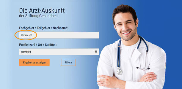 Nutzer:innen der Arzt-Auskunft (www.arzt-auskunft.de) können ab sofort nach Ärzt:innen, Zahnärzt:innen und Psychologischen Psychotherapeut:innen suchen, in deren Praxen Ukrainisch oder Russisch gesprochen wird. Aufgrund der aktuellen Situation hat die Stiftung Gesundheit ihre öffentliche Arzt-Auskunft bis auf Weiteres entsprechend erweitert.