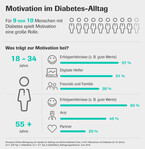 Was trägt zur Motivation im Alltag bei? Hier zeigt sich ein großer Unterschied zwischen jüngeren und älteren Menschen mit Diabetes. Am wichtigsten sind für beide Altersgruppen Erfolgserlebnisse wie gute Werte und Gewichtsabnahme mit 57 Prozent (18 bis 34 Jahre) bzw. 65 Prozent (Generation 55+).
