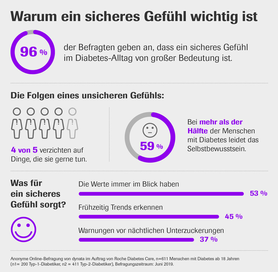 So ist es auch nicht überraschend, dass für 53 Prozent der Befragten ein sicheres Gefühl bedeutet, die Werte immer im Blick zu haben, für 45 Prozent frühzeitig Trends zu erkennen und für 37 Prozent vor nächtlichen Unterzuckerungen gewarnt zu werden.