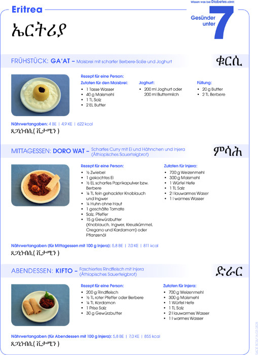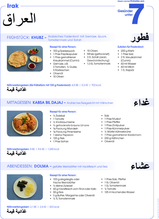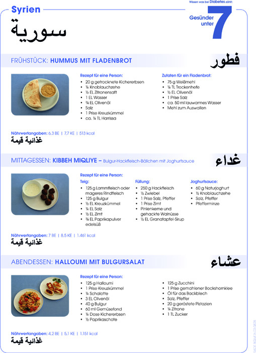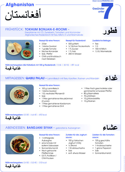 Die Aufklärungsaktion „Wissen was bei Diabetes zählt: Gesünder unter 7“ des Unternehmens Sanofi hat daher für die vier Herkunftsländer, aus denen die meisten Menschen kommen, die derzeit in Deutschland Asyl beantragen (Syrien, Afghanistan, Irak und Eritrea), jeweils ein typisches Frühstück, Mittag- und Abendessen mit den entsprechenden Nährwertangaben recherchiert und berechnet - auch im Vergleich zu dem in Deutschland üblichen Essen.