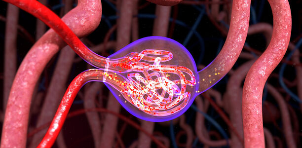 Wesentliche Faktoren sind die Hyperfiltration verbunden mit einer Nierenhypertrophie, welche bei DM Typ 1 unmittelbar nach Krankheitsbeginn bei 34 bis 67 % der Patienten auftreten kann (1), bei DM Typ 2 aber nur in 20 % der Fälle gesehen wird. Die Hyperfiltration wird u.a. durch eine Angiotensin- 2-induzierte Vasokonstriktion des Vas efferens und durch eine multifaktorielle Dilatation des Vas afferens bedingt. So wird z.B. der Natrium-Glukose-Cotransporter (SGLT-1 und SGLT-2) früh im Krankheitsverlauf hochreguliert. Daraus folgt ein erniedrigtes Natriumangebot an der Makula densa, was wiederum zur Freisetzung von Stickstoffmonoxid und Prostanoiden führt und das Vas afferens dilatiert. Diese Hyperfiltration geht einher mit einem erhöhten intraglomerulärem Druck, der profibrotische Mediatoren freisetzt. Der fibrotische Untergang einzelner Glomerula hat eine weitere Hyperfiltration der verbliebenen Glomerula zur Folge.