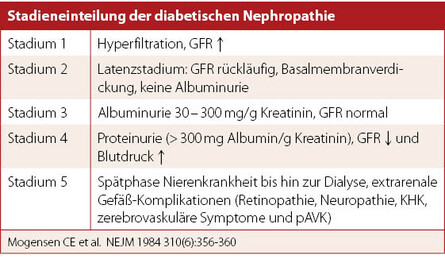 Die Klassifikation von Mogensen, die für Patientinnen und Patienten mit DM Typ 1 entwickelt wurde, ist noch immer gebräuchlich (Tabelle 1). Inzwischen ist aber bekannt, dass bei Menschen mit Diabetes auch ohne Albuminurie eine Verschlechterung der Nierenfunktion eintreten und die Albuminurie-Rate auch ohne Intervention wieder sinken kann.