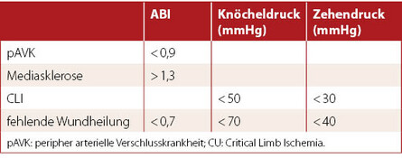 - Apparative Untersuchung: Dazu zählen Gefäßdoppler mit Berechnung des ABI (Knöchel-Arm-Index) (siehe Tab. 2), farbkodierte Duplexsonografie mit Pulskurvenanalyse, Pulsoszillografie der Digitalarterien (DPO) bzw. Licht-Reflexions-Rheografie (LRR) und transkutane Sauerstoffdruckmessung (tcPO2).