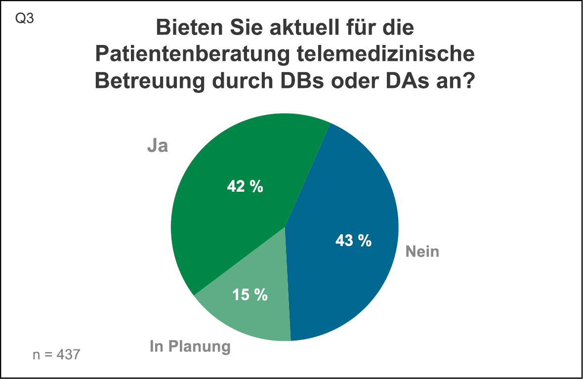 17,2 Prozent gaben an, dass eine telemedizinische Beratung durch den Arzt derzeit in Planung ist, bei der Beratung durch Diabetesfachkräfte sind es 15 Prozent. Demnach würde künftig in immerhin mehr als der Hälfte der Praxen eine digitale Alternative zu Präsenzterminen zur Verfügung stehen.