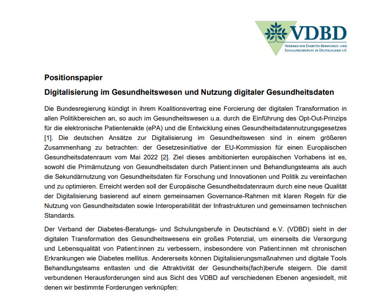 Ein zentrales Element der Digitalisierung des deutschen Gesundheitswesens – auch mit Blick auf den Europäischen Gesundheitsdatenraum – ist die ePA. Der VDBD begrüßt das Opt-Out-Prinzip, so dass nicht die einzelnen Bürger:innen in der Pflicht stehen, sich für eine ePA zu registrieren, sondern diese automatisch erhalten und ggf. aktiv widersprechen können. Um die Vorteile mobiler digitaler Gesundheitsdaten zum Wohle der Patient:innen nutzen zu können, sind auch Gesundheitsfachberufe, wie z.B. Diabetesberater:innen, in die Zugangsregeln zur ePA einzubeziehen.