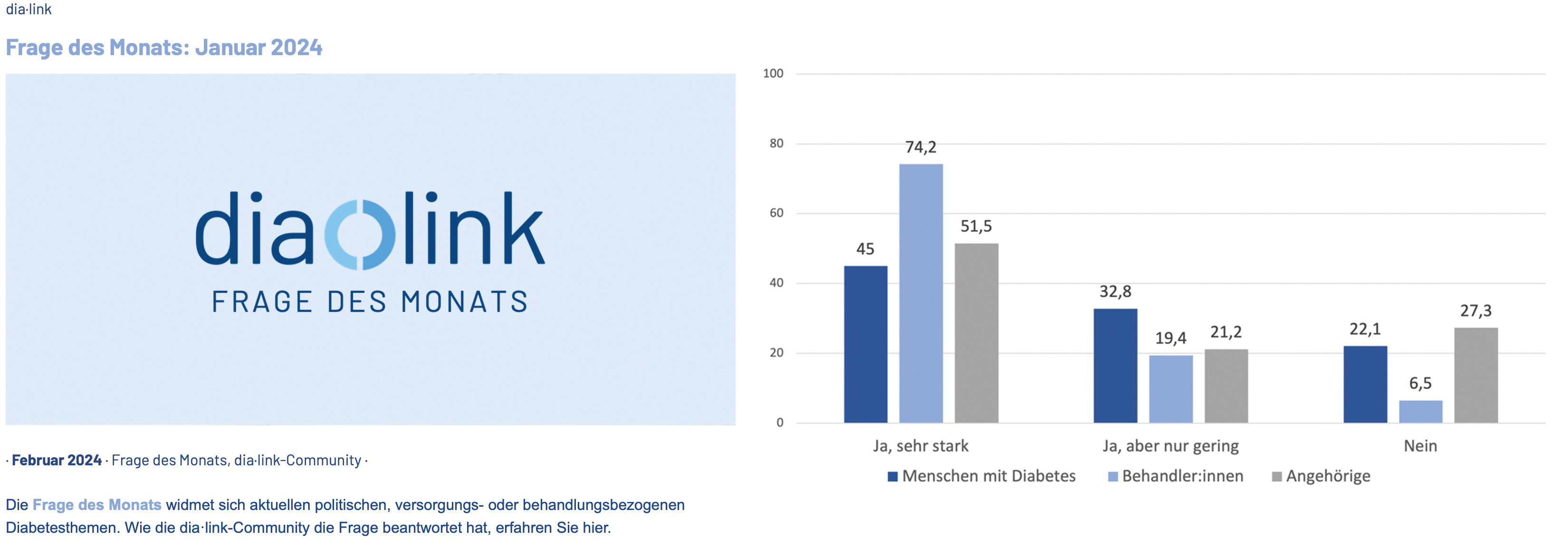 Ein Projekt von dia·link ist die Frage des Monats. Diese widmet sich aktuellen politischen, versorgungs- oder behandlungsbezogenen Diabetesthemen. Einmal im Monat fragen wir die dia-link Community nach ihrer Meinung und erhalten interessante Ergebnisse, wie beispielweise: