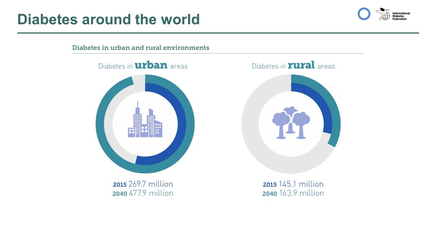 Diabetiker wohnen heute wie auch in 30 Jahren eher in der Stadt: Während 2015 noch 269,7 Millionen Diabetiker in der Stadt wohnen, sind es 2040 schon 477,9 Millionen. In ländlichen Gebieten ist eine geringere Steigerung zu sehen: von 145,1 auf 163,9 Millionen. 2015 gibt es 199,5 Millionen weibliche Diabetiker und 215,2 Millionen männliche Diabetiker, auch 2040 ist das Verhältnis ähnlich geblieben (313,3 vs. 328,4 Millionen).