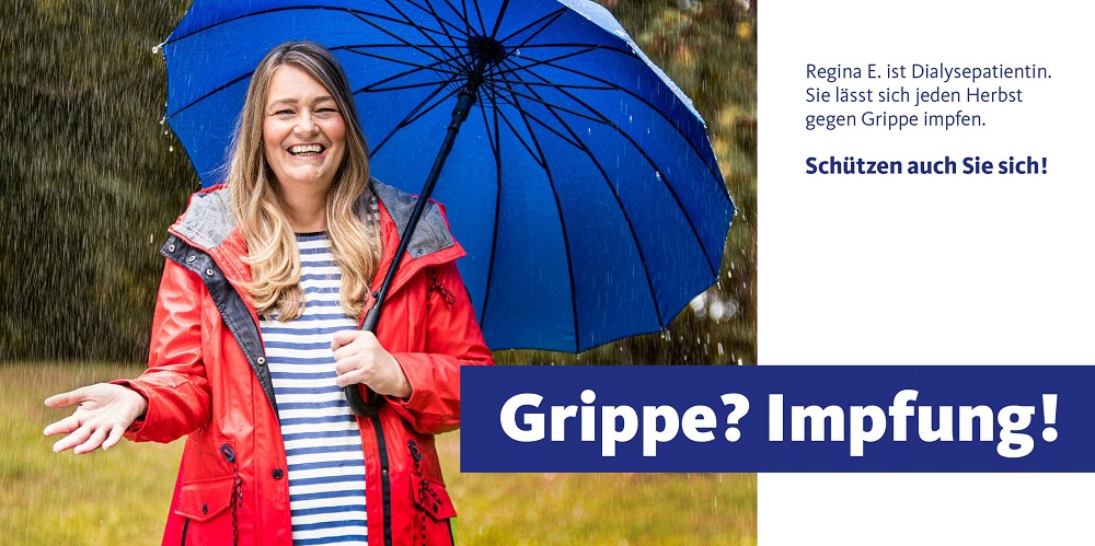 Die Aufklärungskampagne wird mit Plakaten und Flyern begleitet, die bei vielen Nephrologen ausliegen. Das Kampagnenmotiv zeigt eine 52-jährige, „echte“ Dialysepatientin unter einem Regenschirm. Sie steht zwar im Regen, ist dabei aber gut gelaunt, beschirmt und geschützt – auch dank der Grippeimpfung, zu der Regina E. andere Patienten mit chronischer Nierenerkrankung aufruft (siehe folgenden Kasten).