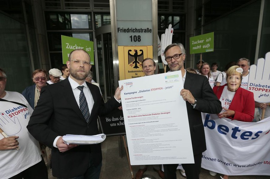 Etwa 100 Teilnehmer demonstrierten am Dienstag, den 11. Juni 2013 von 15.00 Uhr bis 17.00 Uhr im Berliner Regierungsviertel für eine Nationale Diabetes-Strategie für Deutschland. Unter dem Motto „Diabetes STOPPEN – jetzt!“ riefen die Verbände diabetesDE – Deutsche Diabetes-Hilfe, Deutsche Diabetes Gesellschaft (DDG), Verband der Diabetes-Beratungs- und Schulungsberufe in Deutschland (VDBD) und die Selbsthilfeorganisation Deutsche Diabetes-Hilfe – Menschen mit Diabetes (DDH-M) zur Beteiligung an der politischen Kampagne auf.