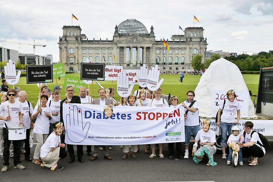 Mit der Demonstration machten sie gemeinsam auf die von der Politik unterschätzte Volkskrankheit Diabetes und die Defizite in der Früherkennung, Versorgung und Forschung aufmerksam. Als Symbolakt wurde ein Zuckerberg vor dem Kanzleramt aufgehäuft, der den Zuckerkonsum pro Jahr in Deutschland symoblisierte: 2,66 Mio Tonnen.